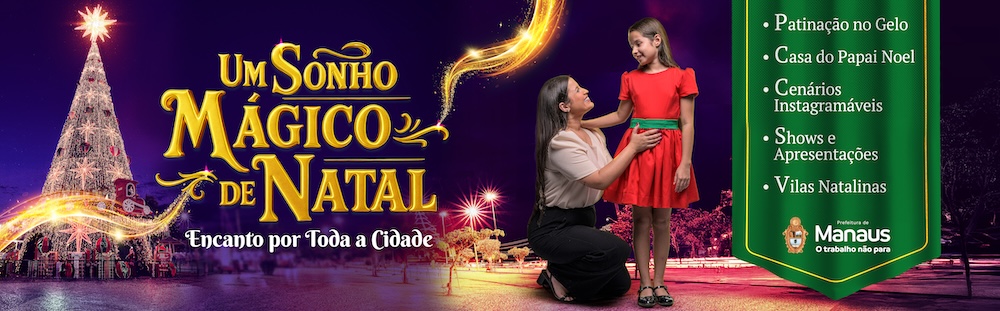 Todos os anos, a Prefeitura de Manaus prepara a cidade para receber o período natalino. Diversos locais, como a Ponta Negra, o Centro da cidade e o Gigante da Floresta, recebem ornamentações especiais para celebrar a data. Este ano, a decoração ganhou uma linda pista de gelo, uma imponente árvore de Natal, além de diversas atrações, como caravana natalina e shows temáticos. Para transmitir o sentimento de um Natal inesquecível para todas as famílias e toda a magia que se espalhou pelos quatro cantos da cidade, foi criado o mote: “Um Sonho Mágico de Natal – Encanto por toda a cidade.”